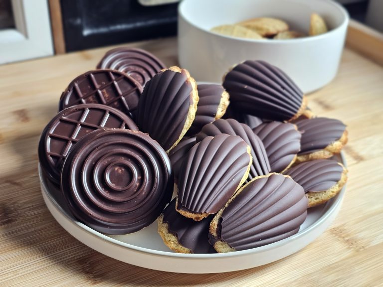 A madeleine 170 fokon körülbelül 15–16 perc alatt sül készre. Pár perc pihenés után rácsra teszem hűlni. A végén olvasztott csokoládéval teszem különlegesebbé: egy vékony réteget simítok a forma aljába, majd visszanyomom rá a kihűlt sütiket, hogy finom, roppanós csokitalpat kapjanak.