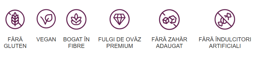 Un produs crocant, bogat în fibre, preparat din fulgi de ovăz premium fără gluten, fructe adevărate, fără zahăr adăugat și aromat cu scorțișoară. Poate fi consumat în orice moment al zilei (recomandat dimineața) ca masă principală sau ca o gustare.