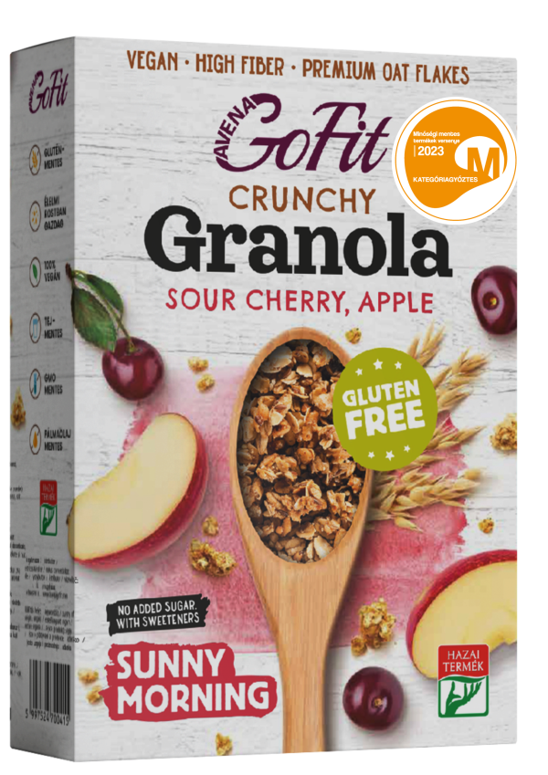 ENERGIA KJ 1458 Kcal 346 ZSÍR (g) 11,7 TELÍTETT ZSÍR (g) 1,8 SZÉNHIDRÁT (g) 50,4 CUKOR (g) 10,6 FEHÉRJE (g) 10,7 ROST (g) 14 SÓ (g) 0,28 Összetevők: Gluténmentes zabpehely (59,5%), meggy készítmény (meggysűrítmény, aszalt meggy szemek) (10 %), alma készítmény (almasűrítmény, szárított almakocka, almapor) (9,8 %), édesítőszer (eritrit, szteviol-glikozidok), hántolt napraforgó mag, növényi rost (csicseriborsó, kukorica), napraforgó olaj, ceyloni fahéj, természetes aroma, só