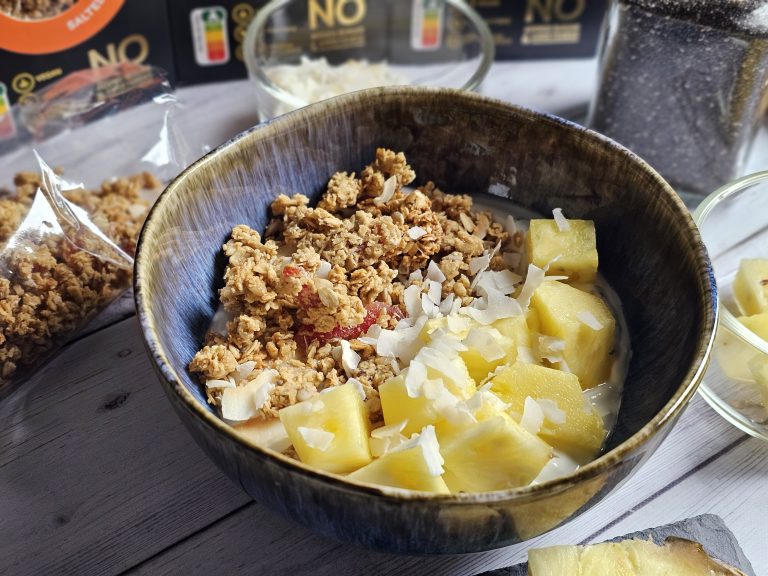 Alapja a krémes kókuszjoghurt chiamaggal, amit feldob az Avena GoFit garantáltan gluténmentes prémium trópusi granolája. Fenségesen ropogós, tele aszalt gyümölcsökkel és kókuszchipsszel. Friss ananásszal és extra kókuszchipszel már kész is a nyári hangulatú reggeli vagy nasi.